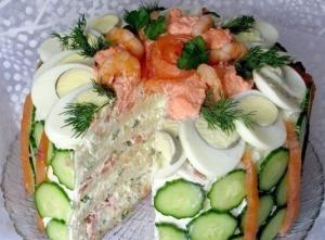 Салат викладається у вигляді торта. Рецепт багатокомпонентний, насичений, поживний і дуже смачний. У класичному рецепті йде червона риба, але якщо ви не любите морепродукти, то можете замінити м'ясом курки або шинкою. Скандинавський торт – це закуска, яка стане прикрасою святкового столу.